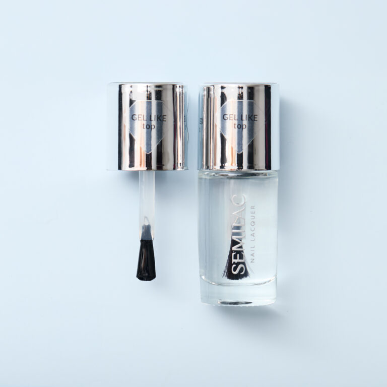 Aplica una capa de Semilac Gel Like Top Coat sobre el esmalte completamente seco para sellar el color, aportar brillo y lograr un acabado de perfecto. Deja secar.